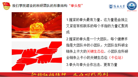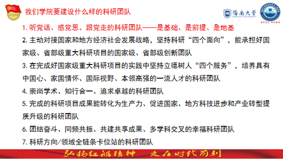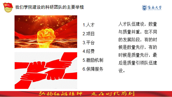 他强调:团队建设与人才队伍建设是一体的。聚焦团队定位、发展目标建设高水平团队。一支高水平的科研团队一定是一支理想信念坚定,忠诚于党和人民教育事业,热爱祖国,热爱中国共产党的团队。团队建设、团队人才引进要与团队的目标和任务相匹配,且要根据团队发展的不同阶段特征进行相应的调整。作为团队负责人要引导团队成员做好个人学术生涯规划,激励每个人才在不同发展阶段都有高质量的发展成果产出。