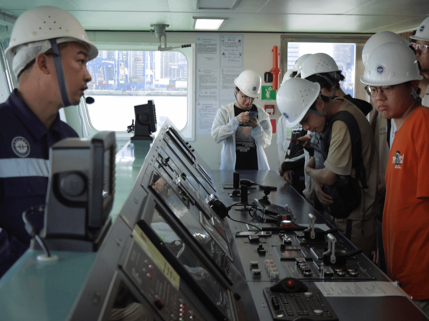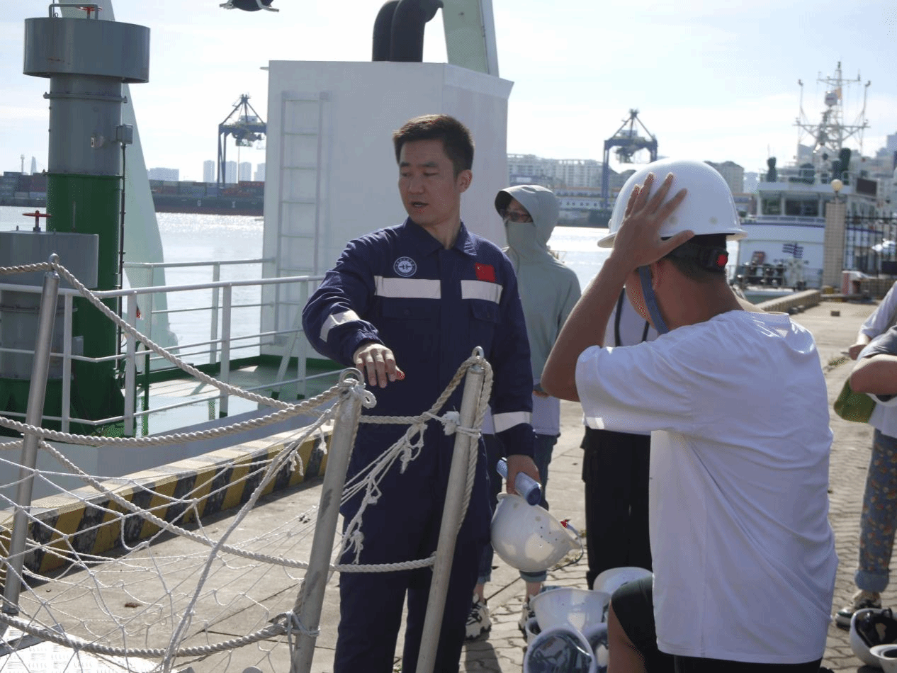 在海口海洋地质调查中心船舶大队队长陈亚东、“海洋地质二十六号”科考船大副匡载芳和工程师刘雨飞等工作人员的组织下,同学们有序入场。参观过程中,学生们认真听取了大副匡载芳对科考船的详细介绍,仔细观察了船上的指挥舱、仪器设备区等关键区域,对科考船的构造与功能有了直观的认识。讲解员表示:“同学们今天状态很好,求知热情高涨。”此次活动加深了学生对海洋科研活动的认知,开阔了视野,增强他们对海洋科学探索和研究的兴趣。