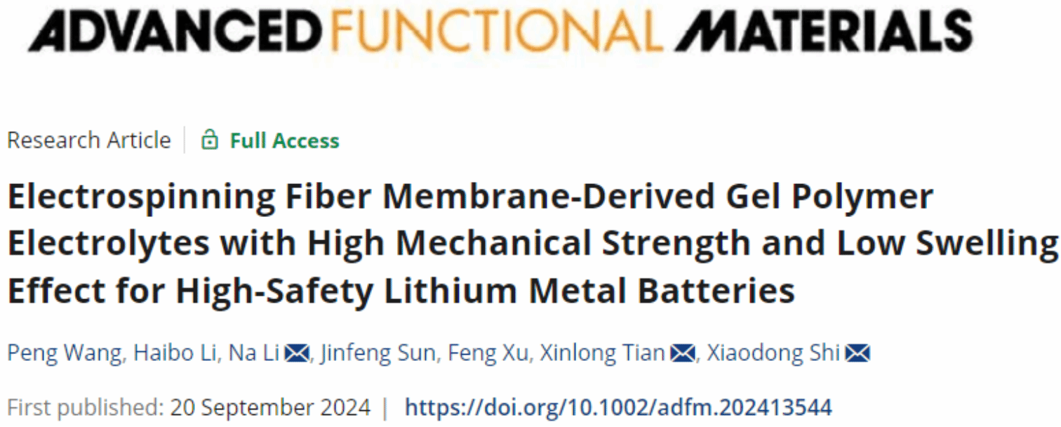 近日,史晓东副教授所在团队在能源化学领域顶级期刊Advanced Functional Materials发表题为“Electrospinning Fiber Membrane-Derived Gel Polymer Electrolytes with High Mechanical Strength and Low Swelling Effect for High-Safety Lithium Metal Batteries”的研究论文。河北科技大学王鹏副教授为论文第一作者,海南大学史晓东副教授和田新龙教授为论文通讯作者。
