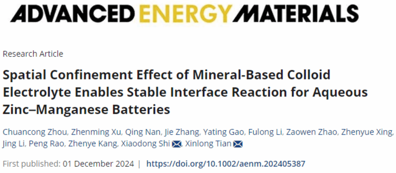 12月1日,史晓东副教授所在团队在能源领域顶级期刊Advanced Energy Materials发表题为“Spatial Confinement Effect of Mineral-based Colloid Electrolyte Enables Stable Interface Reaction for Aqueous Zinc-Manganese Batteries”的研究论文。海南大学2021级博士研究生周传聪为论文第一作者,史晓东副教授和田新龙教授为论文共同通讯作者。