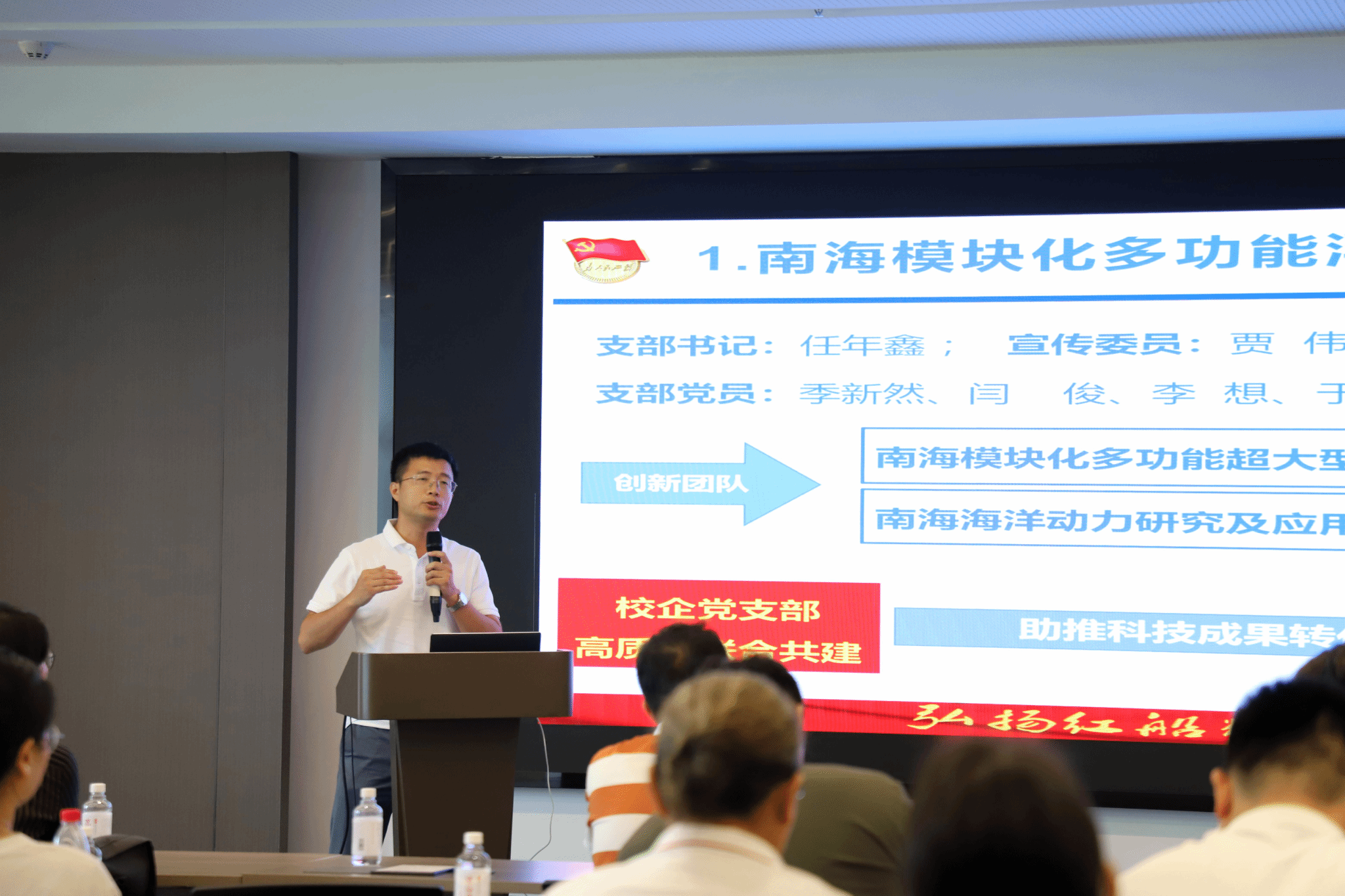 副院长、任年鑫教授,介绍了其科研 团队与行业领军企业开展产学研合作情况及代表性应用成果。团队重点对标海上风电及海洋牧场两大产业需求,提出了南海漂浮式海上风电离岸码头安装解决方案及“ 生态渔业-绿色能源-海洋文旅 ”多产融合发展的新模式。